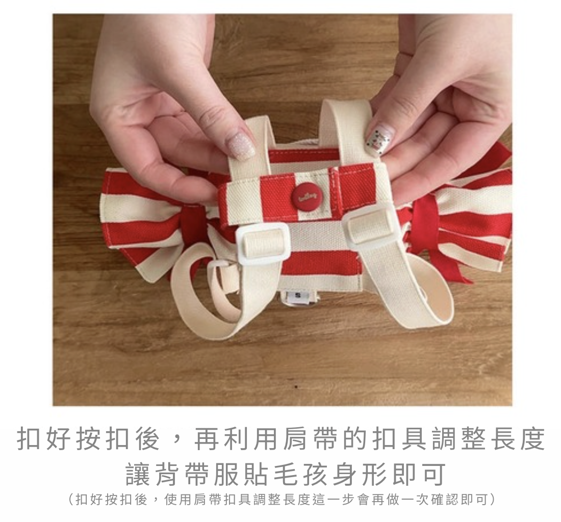 基於安全考量,大型犬款未加上 D 環,僅保留包包本身的收納功能。